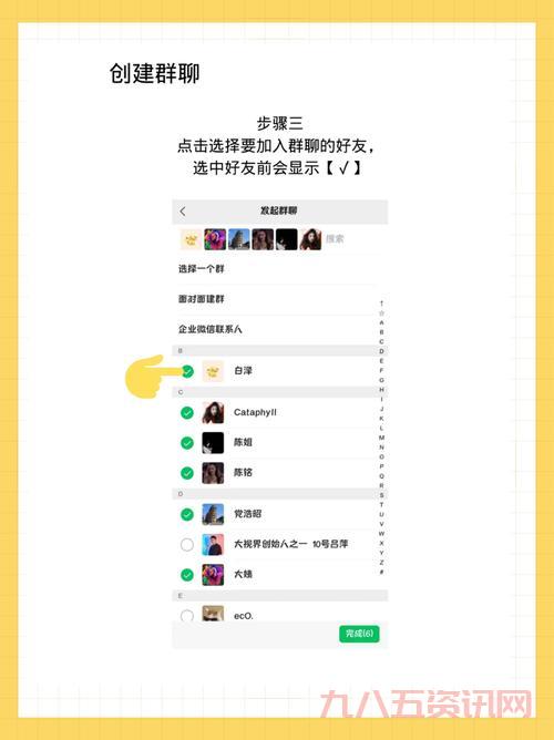 - 选人: 这时候就跳到我的好友列表,把想拉进来的哥们儿一个个勾上。