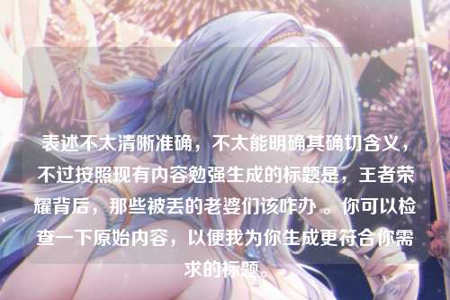 表述不太清晰准确,不太能明确其确切含义,不过按照现有内容勉强生成的标题是,王者荣耀背后,那些被丢的老婆们该咋办 。你可以检查一下原始内容,以便我为你生成更符合你需求的标题。